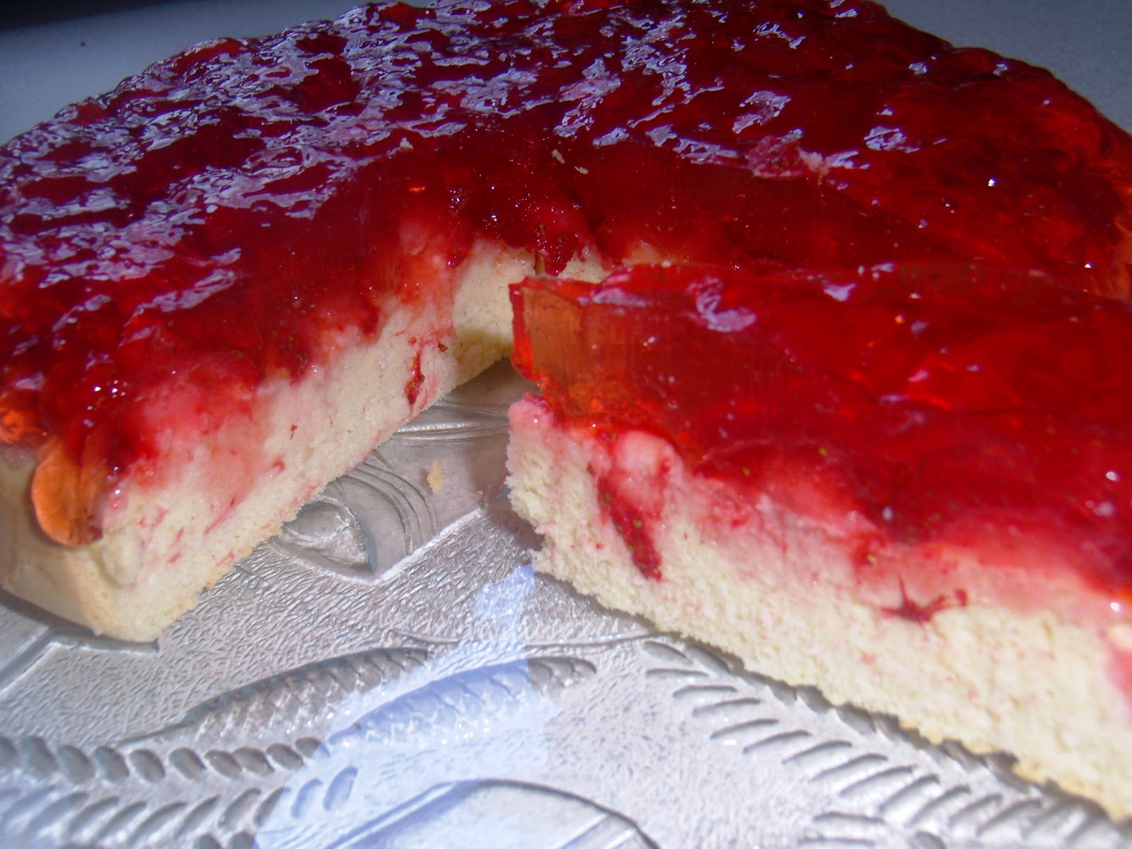 Na zimne ciasto układamy truskawki, zalewamy tężejącą galaretką. Wkładamy do lodówki na 0,5 godz.